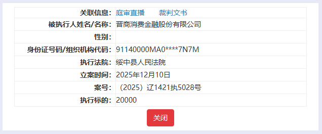 中国经济网北京12月15日电 据中国执行信息公开网消息,金商消费金融有限公司成为被执行人。执行法院为绥中县人民法院。该案立案日期为2025年12月10日,执行目标为2万元。据晋商银行2025年中报显示,2016年2月,晋商银行与其他第三方股东共同出资设立晋商消费金融有限公司,注册于中国山西省太原市。其主要业务在中国,注册资本5亿元人民币,其中金商银行持有金商消费金融有限公司40%的股权。金商消费金融有限公司2025年6月30日的实收资本为5亿元人民币。