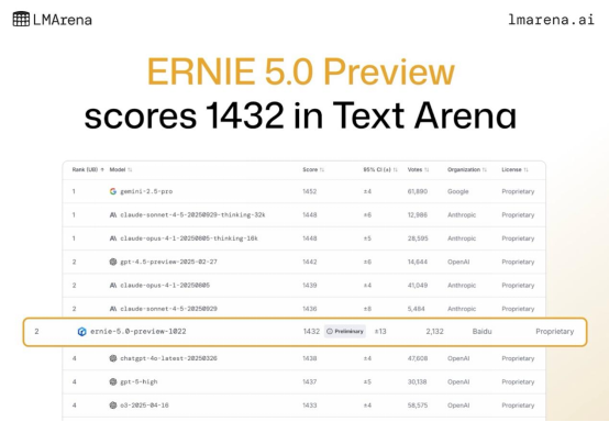 中国经济网北京11月8日电(记者 李芳)根据Lmarena大型模型竞技场最新排名,文心新模型Ernie-5.0-preview-1022文本排名全球并列第二、中国第一。该模型在创意写作、复杂长问题理解、教学合规性等方面表现突出,超过了GPT-5-high等众多国内外主流模型。文心新型号Ernie-5.0-preview-1022在国内Lmarena文本排行榜上排名第一。从清单来看,创意写作可以用来制作文章、营销文案、脚本等内容,大大提高了内容输出的效率。 Ernie-5.0-preview-1022 在创意写作维度上得分第一。复杂的长问题理解用于处理多层逻辑、长文本任务,如学术问答、报告分析、知识推理等。以下指令保证模型能够准确理解并执行用户意图,适用于智能助手、代码生成、业务流程自动化等场景。在理解复杂长问题和遵循指令这两项指标上,Ernie-5.0-preview-1022 得分完美,为多场景内容生成提供了出色的支持。据此前消息,最新的文心大模型基础模型将于下周11月13日的2025百度世界大会上正式发布。公开资料显示,文鑫大车型将于2019年公开亮相,经过6年的技术研发多元化,2025年将推出文鑫大车型4.5、4.5turbo多模态车型,以及文鑫X1深度思考车型,